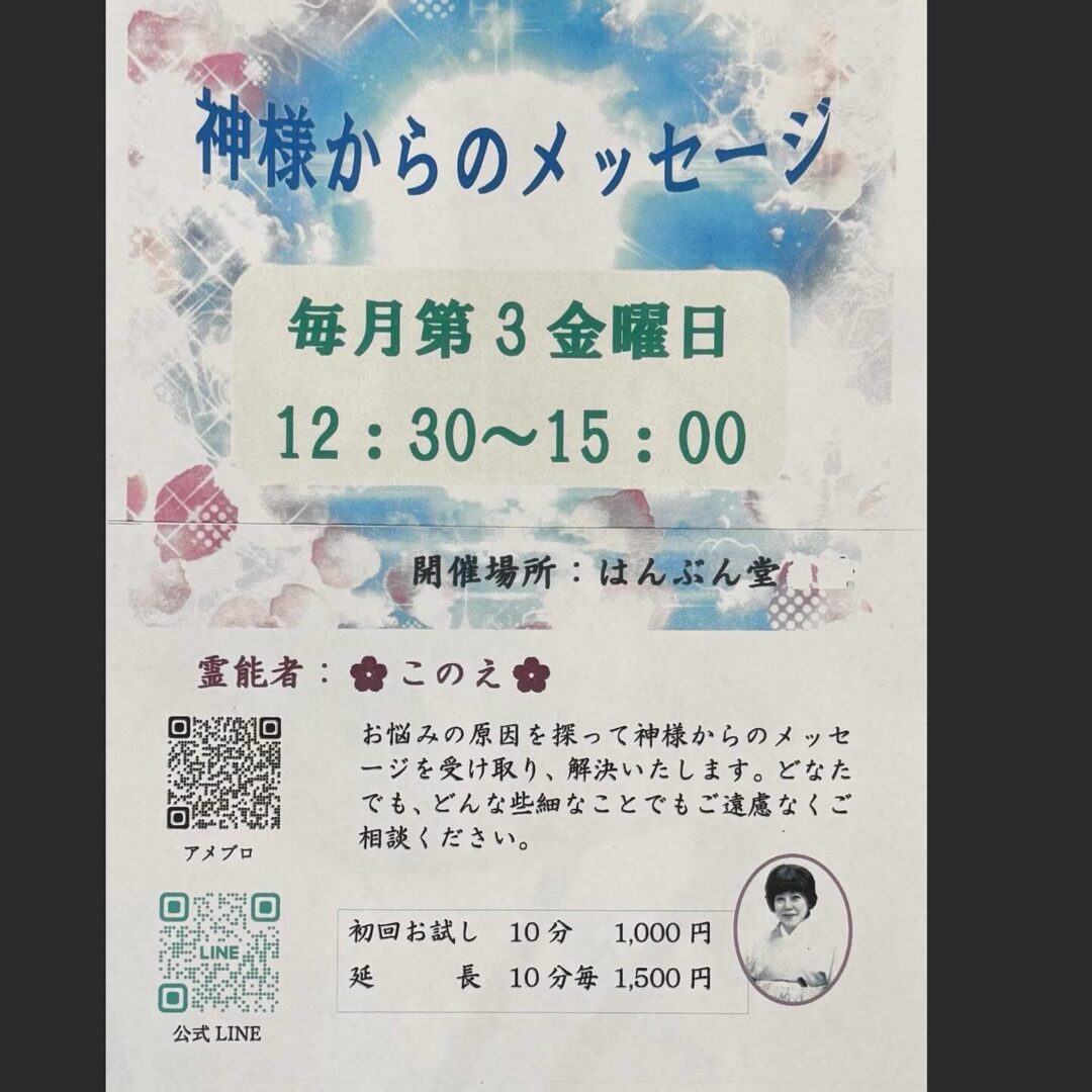 今週の金曜日は「神様からのメッセージ」の日です。何かお困り事や悩み事があればこのえ先生に聞かれてはどうですか?神様からお伝えとして聞いてくれますよ!