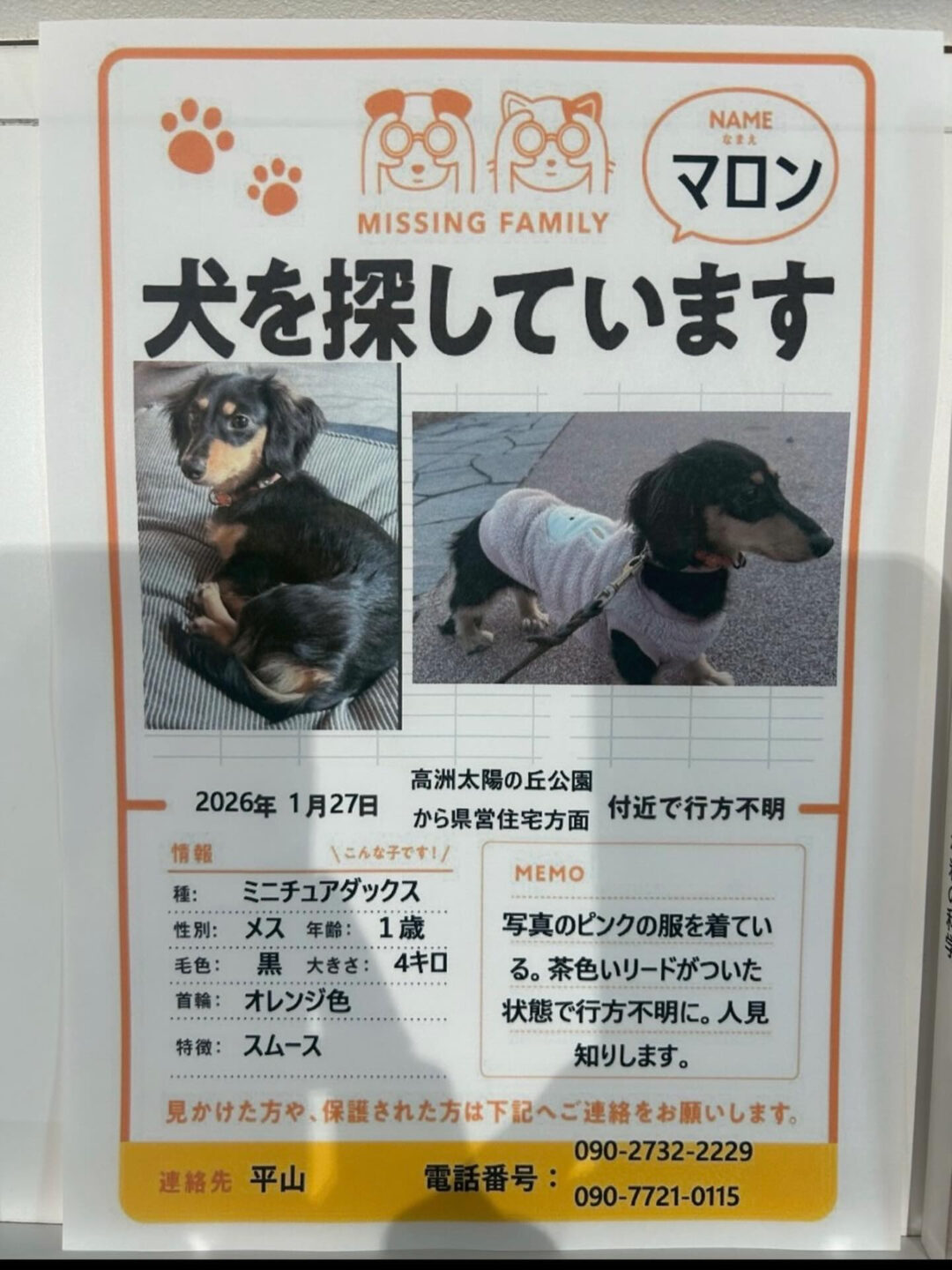 ミニチュアダックスのマロンちゃん(女の子)1歳が行方不明になっています。誰か心当たりのある方はお知らせください。