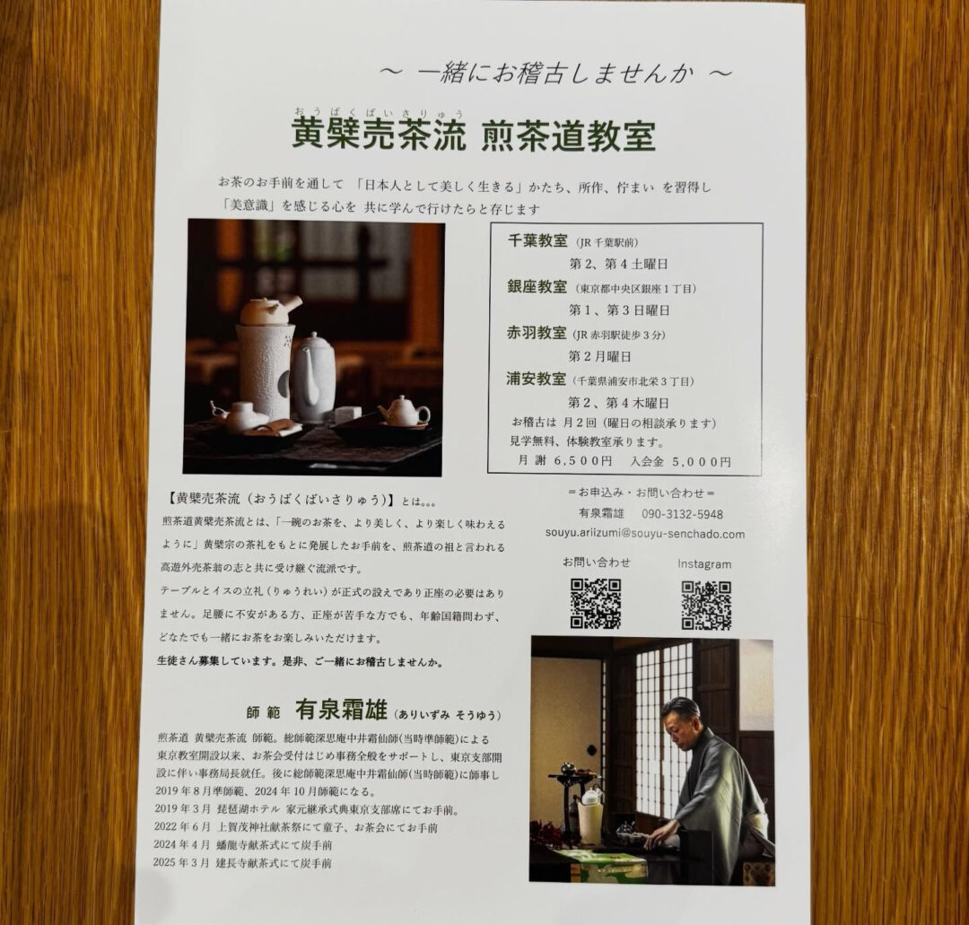 月2回煎茶道教室を開催しております。師範の有泉霜雄氏による「黄檗売茶流 煎茶道教室」です。