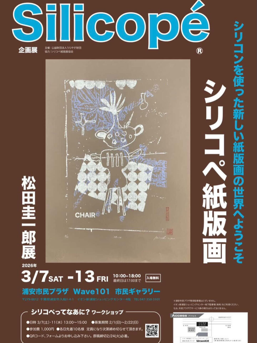 場所は新浦安駅前のイオンの4階の浦安市民プラザ Wave101 市民ギャラリーです。是非シリコペの技法を松田画伯に聞いて見て下さい。画期的な版画技法です。