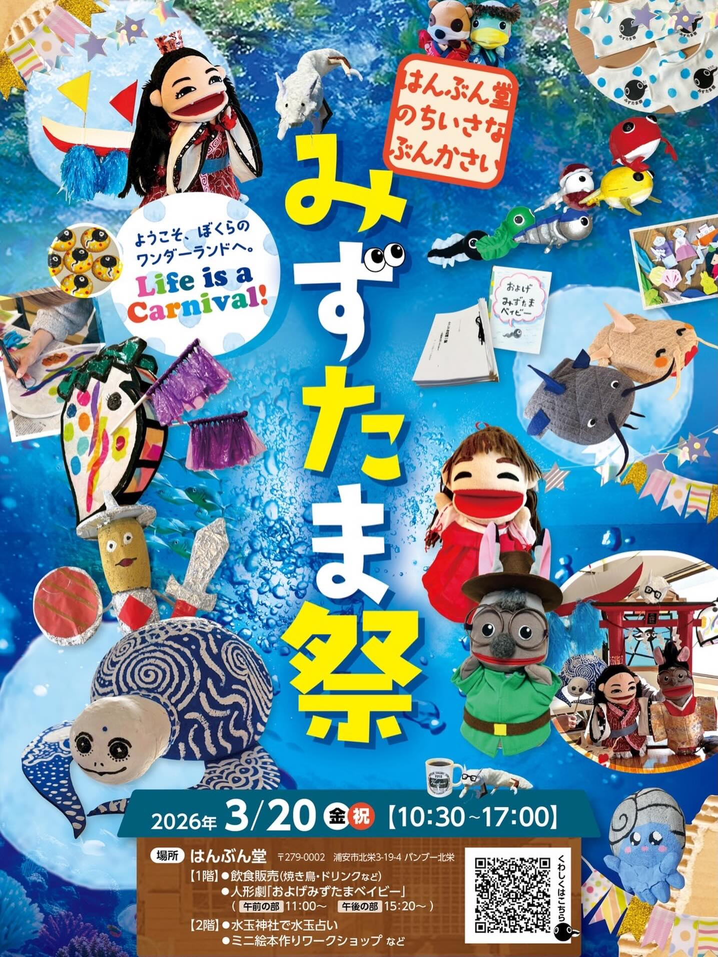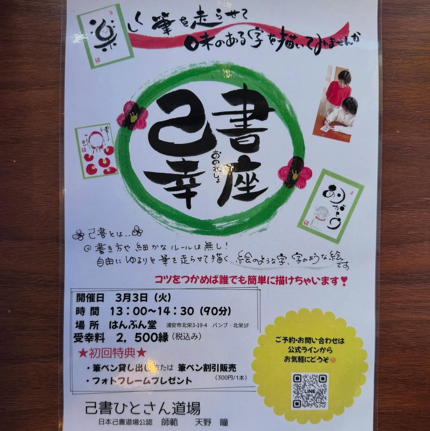 R8.2/28(土) 「はんぶん堂」11:00〜18:00営業です。 もう明日から3月です。つい最近お正月が終わったと思ったのにもうって感じです。 そんな時はんぶん堂に来て下さい。 「さっちゃん ワールド 木の実アート展 […] R8.2/27 (金) 「はんぶん堂」11:00〜18:00営業です。 来週の火曜日はワークショップがあります。 3/3(火)に「己書幸座」があります。おのれしょとは書き方や細かいルールは無く自由にゆるりと筆を走らせて描 […] R8.2/26(木) 「はんぶん堂」は11:00〜18:00営業です。 おかげさまで昨日(2/25)ではんぶん堂はまる7年を迎える事ができました。本当にありがとうございます。 今年初のイベントは本日から始まる「さっちゃん […] R8.2/24(火) 「はんぶん堂」11:00〜18:00営業です。 3/20は「みずたまの日」はんぶん堂ではこの日にちなんで「みずたま祭」を開催します。小さな文化祭です。焼き鳥もビールもジュースもあります。 みずたま占 […] R8.2/21(土) 「はんぶん堂」11:00〜18:00営業です。 猫の絵の付せん紙入りました。 台紙をカバーに挟んで携帯できます。 1パック ¥420+税 R8.2/20(金) 「はんぶん堂」11:00〜18:00営業です。 二人展のご案内です。少し先になります。3/21〜31までです。 「水谷俊雄・香織 うつわ展」水谷ご夫婦による二人展です。新作もいろいろあり楽しみな陶芸 […] R8.2/19(木) 「はんぶん堂」11:00〜18:00営業です。 トナー式のコピー機を導入しました。A4〜A6サイズになります。 なのでA4サイズ以上のサイズは出来ません。 通常のコピー用紙はセットしています。それ以 […] 【はんぶん堂のサテライトラジオ/第13話】 本日は、きょうこ姫とホクレア姫の『姫トーク』✨ @2525_kyoko @miyuki.wonderland 3月20日(金㊗️)浦安市はんぶん堂水玉祭にて人形劇『ホクレア号危 […] R8.2/17(火) 「はんぶん堂」11:00〜18:00営業です。 来月になりますがはんぶん堂で初めての書のワークショップがあります。 3月3日(火) 13:00からです。 「己書幸座(おのれしょこうざ」です。受幸者を […]