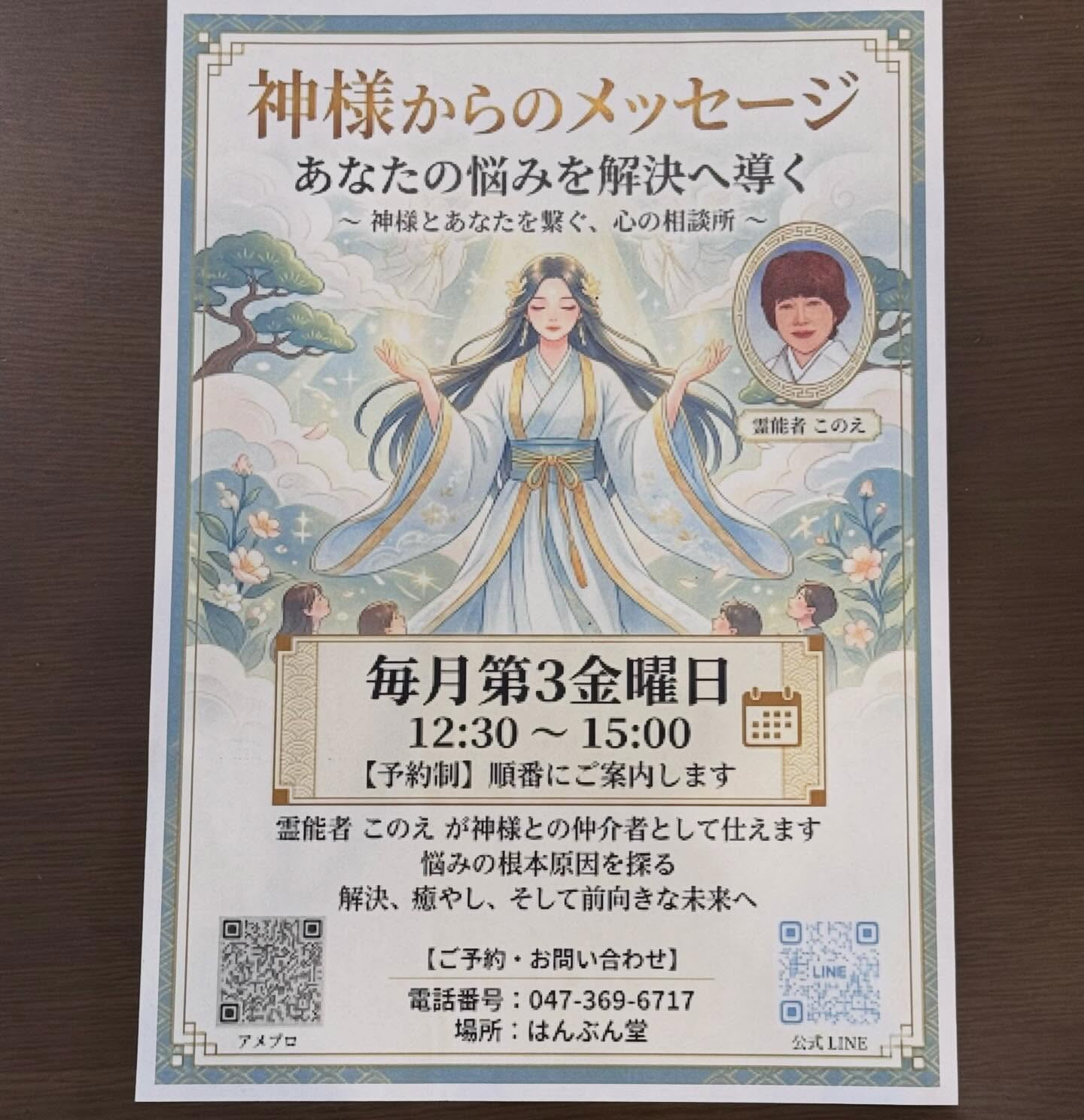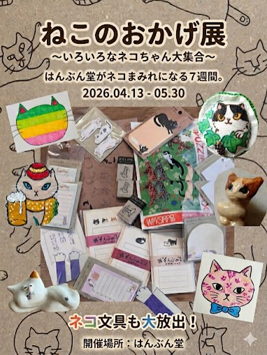 R8.4/18(土) 「はんぶん堂」11:00〜18:00営業です。 「ねこのおかげ展」5日目です。初回よりねこ文具を少しだけ増やしました。ねこシールやねこポチ袋他です。 今日は天気も良いので散歩のついでにでもお立ち寄り […] R8.4/17(金) 「はんぶん堂」11:00〜18:00営業です。 「ねこのおかげ展」4日目です。最初とちょっとだけ変わってます。 猫好きな方は是非みて下さい。作家さんによってねこの仕草や表情がみんな違います。 表情見 […] R8.4/16(木) 「はんぶん堂」11:00〜18:00営業です。 明日(4/17)は「神様からのメッセージ」があります。霊能者のこのえさんがあなたの悩みを解決してくれます。 神様とあなたを繋ぐ、心の相談所!是非あなた […] R8.4/14(火) 「はんぶん堂」11:00〜18:00営業です。 昨日から始まってます。「ねこのおかげ展」。 いろいろな猫たちがいます。あなたはどの猫が好きですか! 表情や仕草がみんな違います。見るだけでも気に入れば […] R8.4/11(土) 「はんぶん堂」11:00〜18:00営業です。 ツトム・イサジ個展。最終日です。17:00までしか見られませんよ。天気は絶好調に良いので散歩の途中にでもお立ち寄り下さい。 冷たいコーヒーやジュースも […] R8.4/10(金)「はんぶん堂」11:00〜18:00営業です。 ツトム・イサジ個展明日までです。終わっちゃいますよ。まだ見られてない方是非見に来て下さい。ツトム・イサジの世界に連れて行かれちゃいますよ! R8.4/9 (木) 「はんぶん堂」11:00〜18:00営業です。 ツトム・イサジ個展残すところ本日入れて3日となりました。 まだ「絵で音楽を奏で、遊んでみる。」観られてない方見て下さい。先日の4/5の日は「音楽で絵を […] R8.4/7 (火) 「はんぶん堂」11:00〜18:00営業です。 ツトム・イサジ個展「小さな『音楽戯画展」』絵で音楽を奏で、遊んでみる。6日目です。本日は作家さん在廊してませんが絵は観られます。メルヘンのようなフ […]
